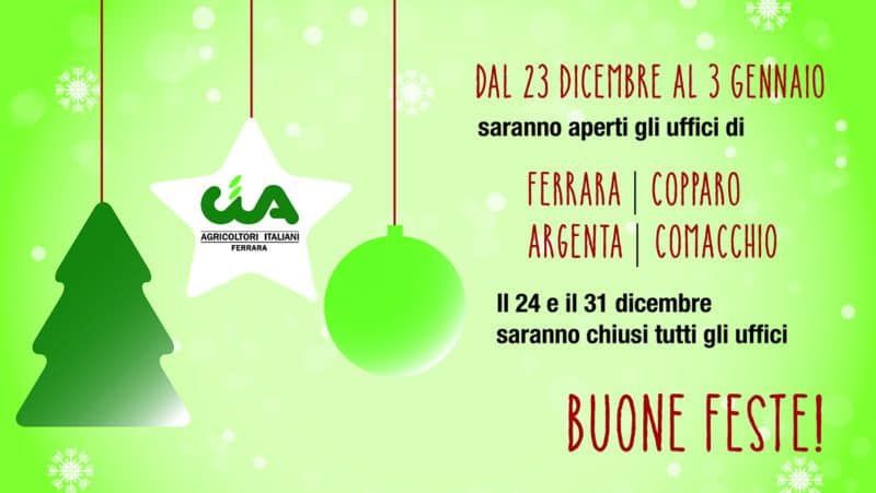 Buone Feste! Scritto il 9 Dicembre 2019. Pubblicato in Notizie in primo piano - Ferrara. Si comunica a tutti i soci che nelle due settimane di Natale, dal 23 dicembre al 3 gennaio, saranno aperti gli uffici di: Ferrara, Copparo, Argenta, Comacchio. Il 24 e 31 dicembre tutti gli uffici saranno chiusi. Condividi:Fai clic qui per condividere su Twitter (Si apre in una nuova finestra)Fai clic per condividere su Facebook (Si apre in una nuova finestra)Fai clic per condividere su WhatsApp (Si apre in una nuova finestra)Mi piace:Mi piace Caricamento... Correlati Precedente Successivo