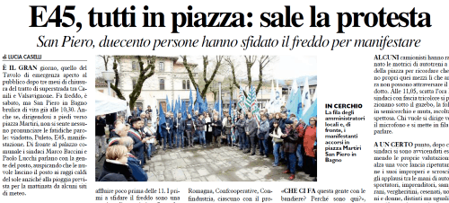E45, tutti in piazza: sale la protesta Scritto il 15 Aprile 2019. Pubblicato in Rassegna Stampa Romagna. Il Resto del Carlino, 14 aprile 2019: “Viabilità negata. E45, tutti in piazza: sale la protesta. San Piero, 200 persone hanno sfidato il freddo per manifestare” Clicca qui per leggere l’articolo Condividi:Fai clic qui per condividere su Twitter (Si apre in una nuova finestra)Fai clic per condividere su Facebook (Si apre in una nuova finestra)Fai clic per condividere su WhatsApp (Si apre in una nuova finestra)Mi piace:Mi piace Caricamento... Correlati Precedente Successivo