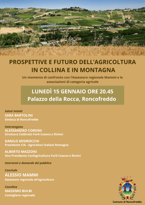 Il 15 gennaio alle 20.45 l’appuntamento a Roncofreddo (FC), al Palazzo della Rocca, è su un grande argomento che riguarda le prospettive e il futuro dell’agricoltura in collina e in montagna e quindi interessa tutti. Il confronto è fra le organizzazioni del mondo agricolo – Cia, Coldiretti e Confagricoltura – e la Regione, rappresentata dall’assessore Mammi e dal consigliere Bulbi. Per Cia Romagna interviene il presidente Danilo Misirocchi.