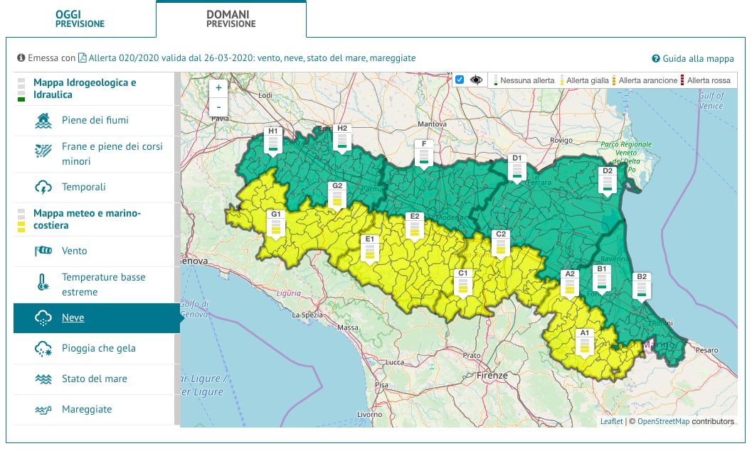 “Per la giornata di domani 26 marzo si prevedono precipitazioni a carattere nevoso su tutta la fascia appenninica – recita il testo -, con valori di neve compresi tra 20 e 40 cm sulle zone di crinale e tra 10 e 20 cm lungo la fascia pedemontana. Episodi di pioggia mista a neve saranno probabili anche in pianura, ad esclusione della fascia orientale. In particolare sui centri urbani lungo la via Emilia si potranno verificare locali temporanei episodi nevosi con modesti accumuli di pochi centimetri. Le precipitazioni nevose sono previste diffuse nella prima parte della giornata, con progressivo innalzamento della quota neve che dal pomeriggio interesserà solo la fascia montuosa e di alta collina. Ventilazione costante da nord-est su tutto il territorio con valori superiori alle soglie in Appennino (intorno ai 60/70 km/h con raffiche di intensità superiore). Mare molto mosso sottocosta, localmente agitato al largo (altezza dell’onda fino a 4 metri), con possibili fenomeni di criticità costiera”.