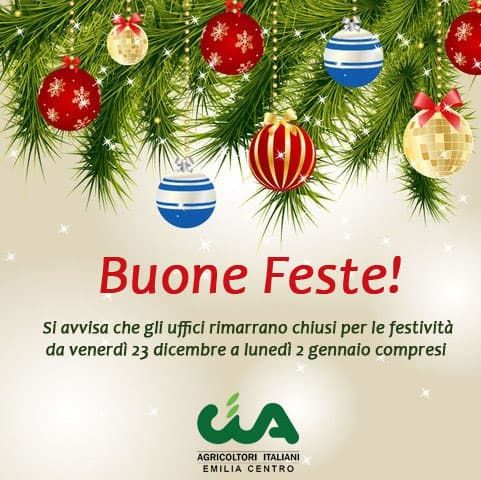 Auguri di buone Feste Scritto il 14 Dicembre 2022. Pubblicato in Comunicati stampa - Emilia Centro. La Cia Emilia Centro ricorda che gli uffici saranno chiusi per le festività da venerdì 23 dicembre a lunedì 2 gennaio compresi. Condividi:Fai clic qui per condividere su Twitter (Si apre in una nuova finestra)Fai clic per condividere su Facebook (Si apre in una nuova finestra)Fai clic per condividere su WhatsApp (Si apre in una nuova finestra)Mi piace:Mi piace Caricamento... Correlati buone feste Precedente Successivo