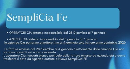 Gli operatori Cia quindi, non potranno emettere fatture elettroniche in detto periodo, mentre le imprese associate che si avvalgono della procedura SempliCiaFe potranno continuare ad emettere FATTURE ELETTRONICHE per l’anno 2023, fino al 4 Gennaio 2024, dopodiché il sistema sarà anche per loro inaccessibile, limitatamente ai giorni 5, 6 e 7 Gennaio 2024.