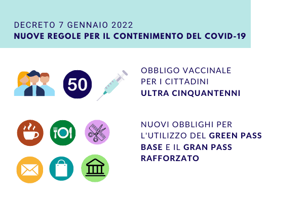 E’ stato introdotto l’obbligo di vaccino per tutti gli over 50 (l’obbligo dura fino al 15 giugno e riguarda tutti coloro che a tale data avranno compiuto 50 anni). A partire dal 1° febbraio si è soggetto a una sanzione di 100 euro per gli inadempienti, irrogate dall’Agenzia delle Entrate, che effettuerà i controlli sui dati delle anagrafi vaccinali.